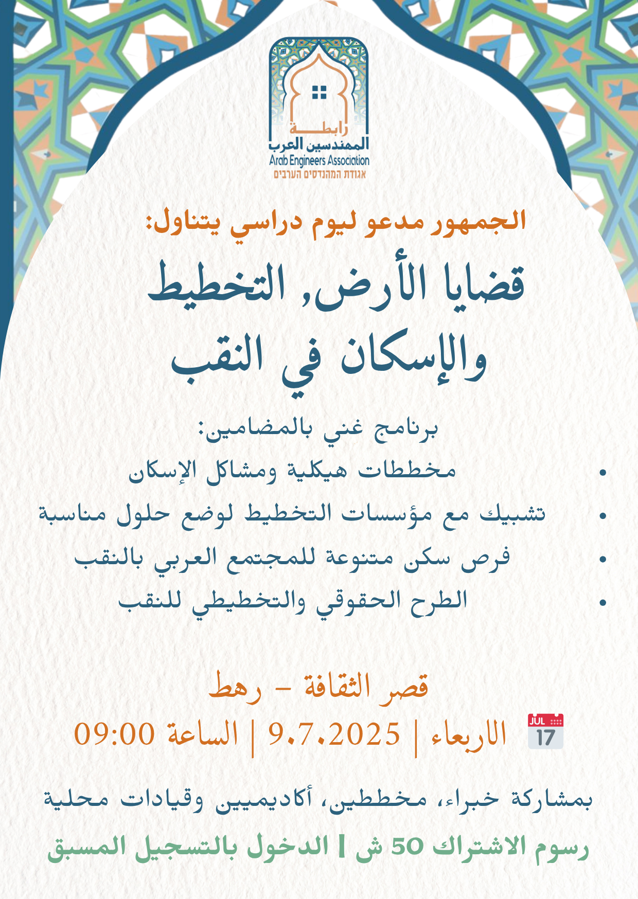 يسرّ رابطة المهندسين والمعماريين العرب دعوتكم للمشاركة في يوم دراسي فريد من نوعه في مدينة رهط، تحت عنوان: